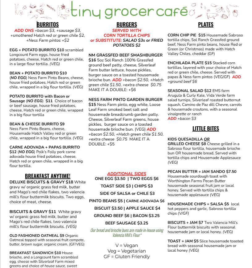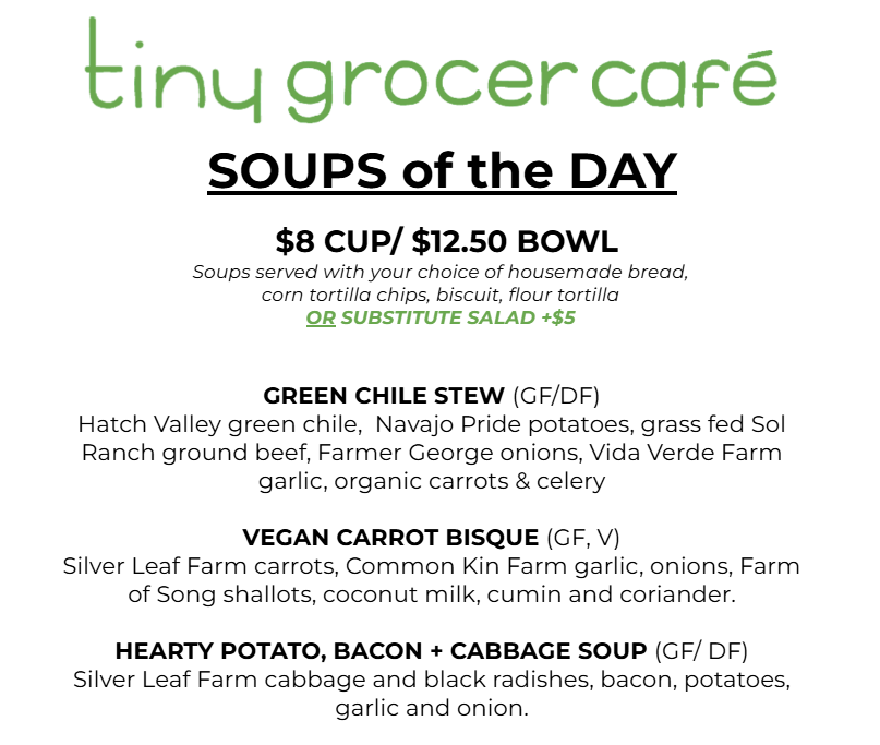 Menu Changes Daily - everything we use is sourced from the local farms and made in small batches, so sometimes we run out of dishes before the end of the day. You are welcome to call in an order for pick up! Thank you for supporting!