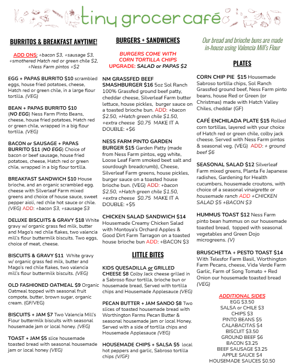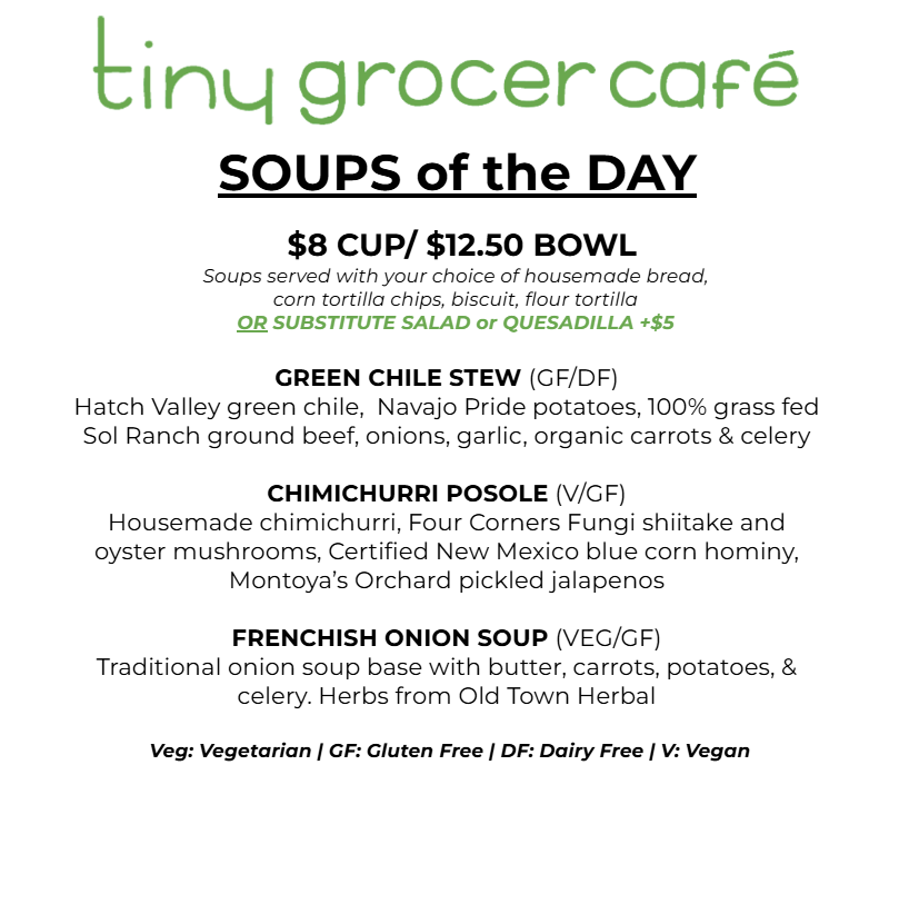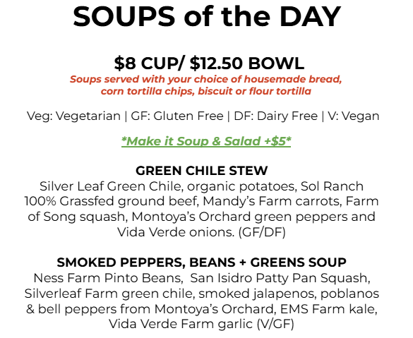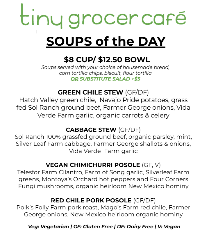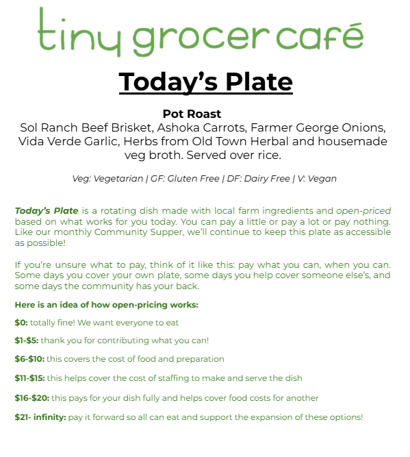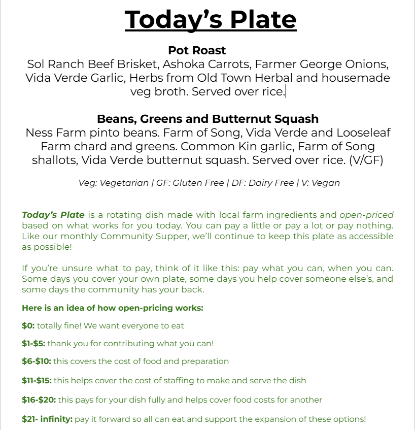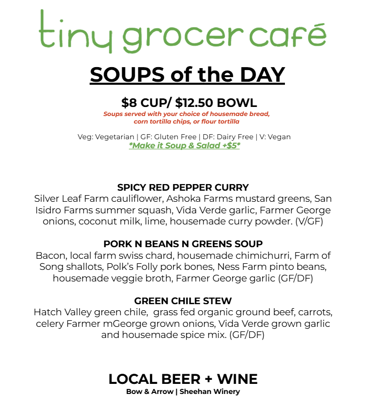 Menu Changes Daily - everything we use is sourced from the local farms and made in small batches, so sometimes we run out of dishes before the end of the day. You are welcome to call in an order for pick up! Thank you for supporting!