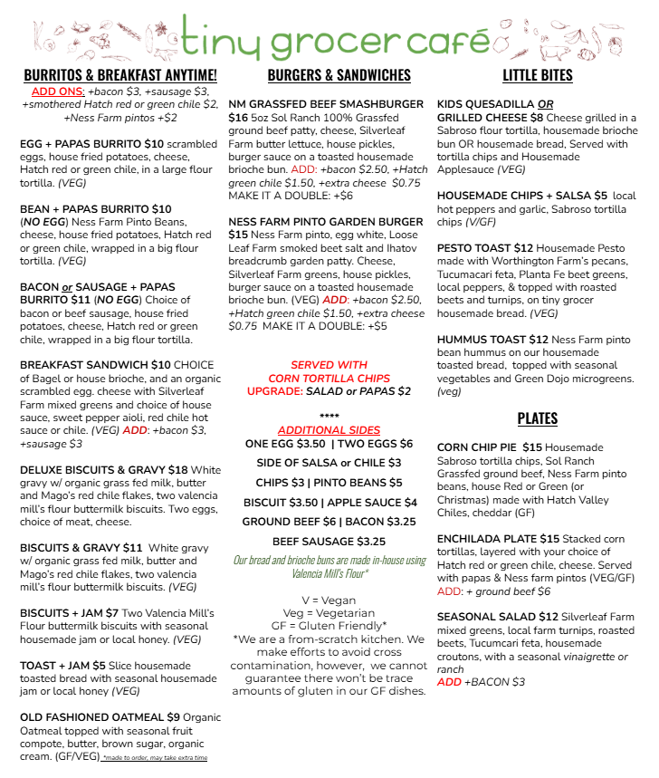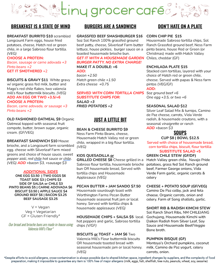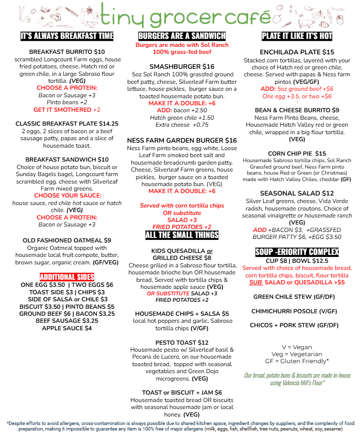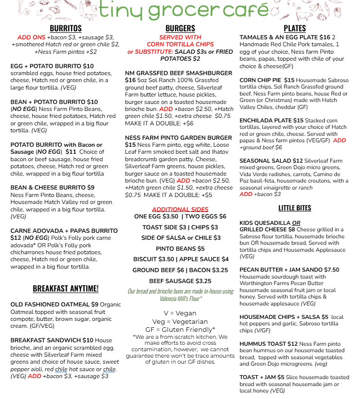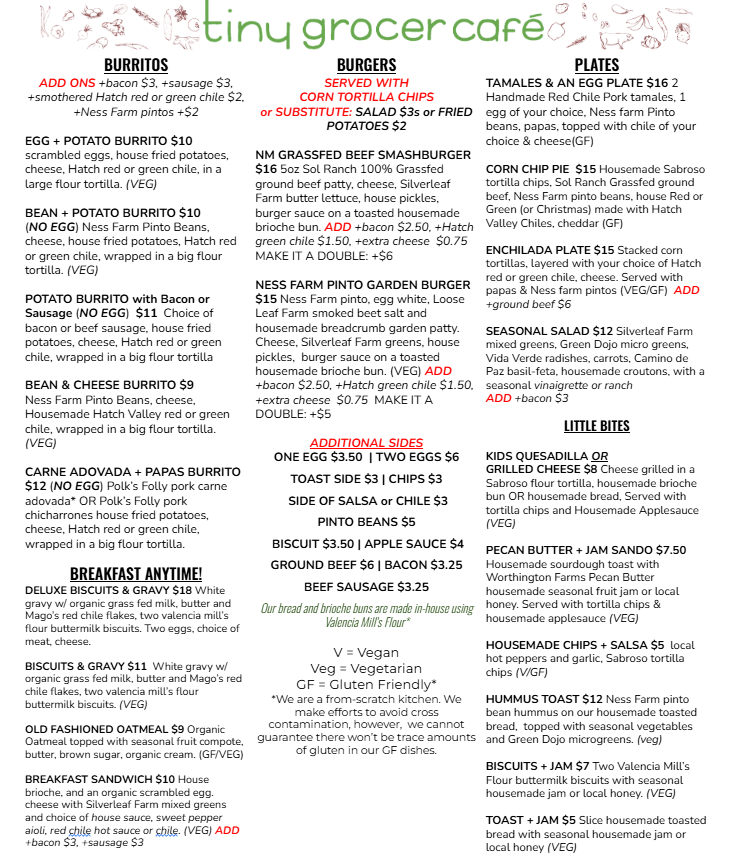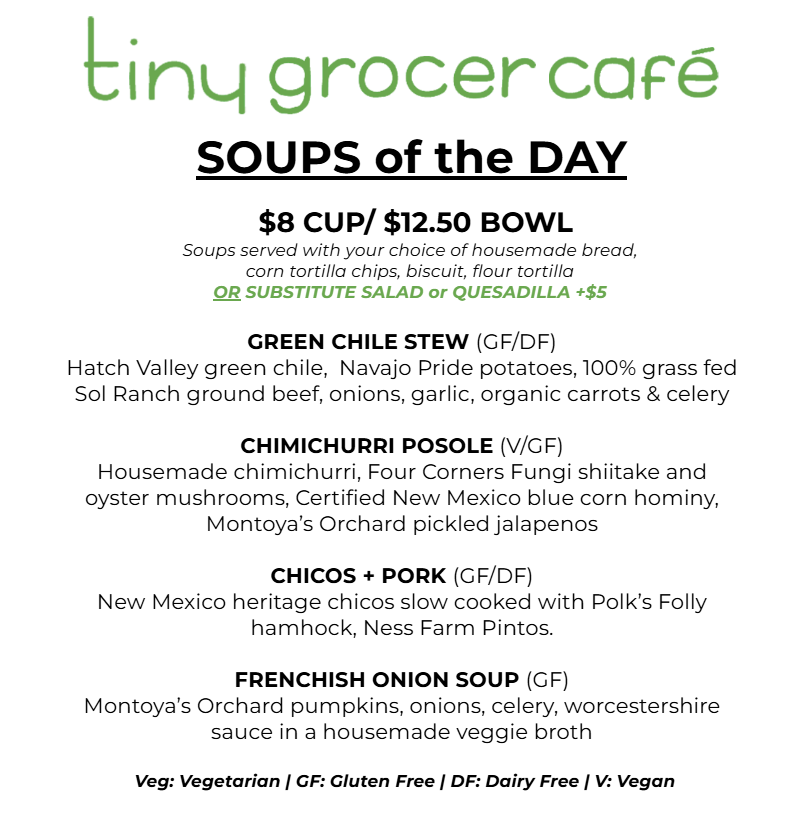 Menu Changes Daily - everything we use is sourced from the local farms and made in small batches, so sometimes we run out of dishes before the end of the day. You are welcome to call in an order for pick up! Thank you for supporting!