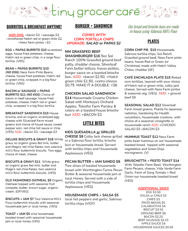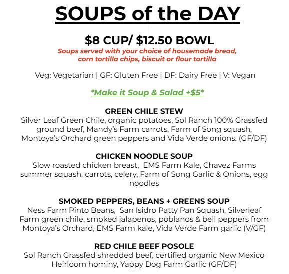 Menu Changes Daily - everything we use is sourced from the local farms and made in small batches, so sometimes we run out of dishes before the end of the day. You are welcome to call in an order for pick up! Thank you for supporting!